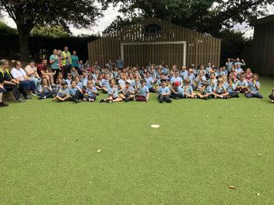 We gathered as a community to say thanks for the Harvest and school council introduced us to Fairtrade.