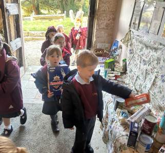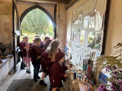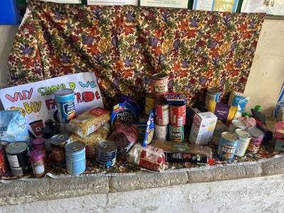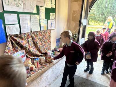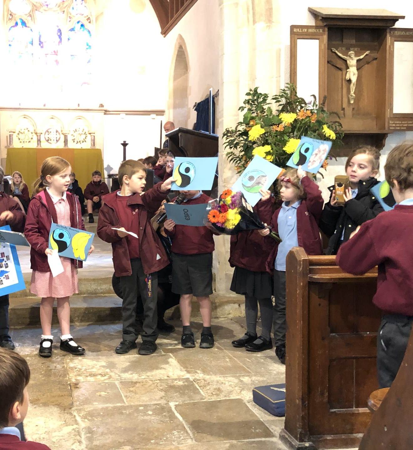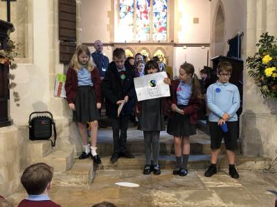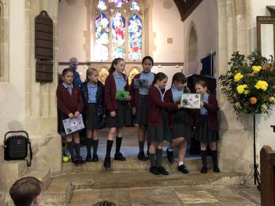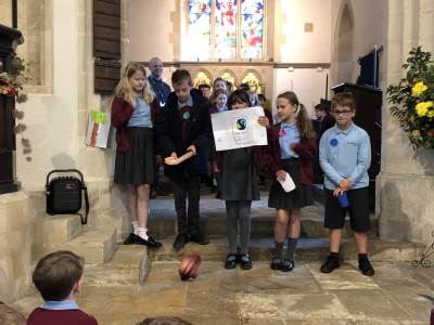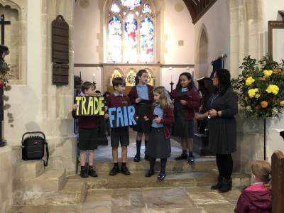 We gathered as a community to say thanks for the Harvest and school council introduced us to Fairtrade.