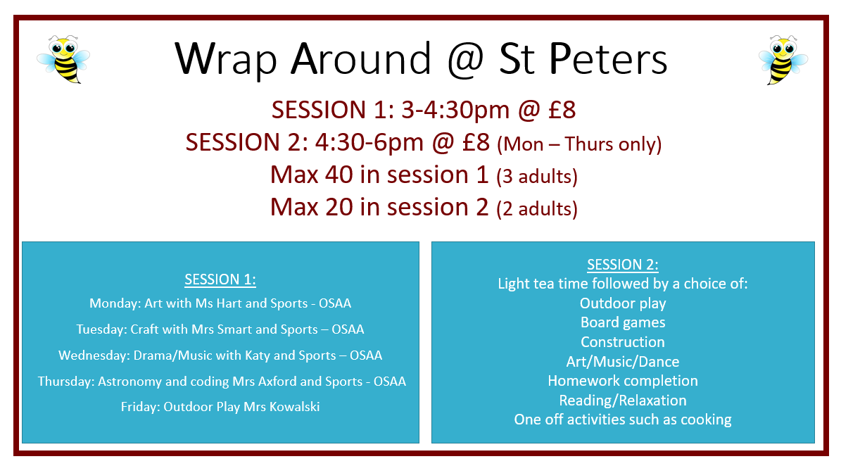 Collection can be anytime up to 6pm. Late collection may result in attendance at club being withdrawn. In an emergency please call 01993 842535 or email office@stpeters.oxon.sch.uk