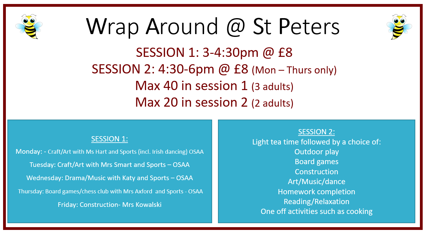 Wrap Around care at St Peter's comprises of Early WASP club and After School WASP club. Mrs Kowalski is our WASP manager. The initial set up of this is facilitated with support from Oxfordshire County Council and set up in response to requests from parents. It can be booked in advance, to allow for parents to plan ahead or on the day to provide for last minute need. It can be booked via MCAS.